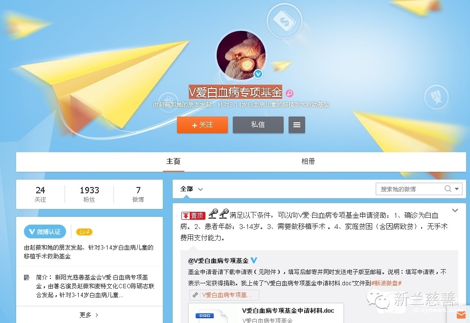 【转】2014年平安夜以赵薇名义成立的V爱.白血病基金诞生!这是一个专项资助3岁到14岁孩子白血病移植手术的公益组织。自12月29日公布V爱基金账户至昨日,赵薇捐助的100万和她朋友陈砺志捐助的50万已经到账!还收到24位爱心人士的热心粉丝84490元捐款(其中一位已两度捐赠)。