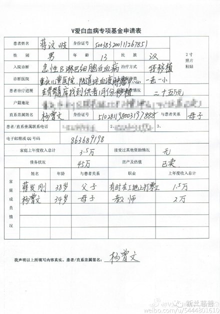 V爱·白血病专项基金确定首位资助对象是蒋汶岐,男,13岁,重庆人,2014年8月查出患急性淋巴细胞白血病。父亲和孩子连续遭遇重大疾病,摧毁了这个原本生活条件不错的家庭,等到移植供体后的蒋汶岐急需25万手术费用,V爱基金一次性资助20万元。小汶歧预计下周就可以移植手术,祝福他一切顺利,早日康复!